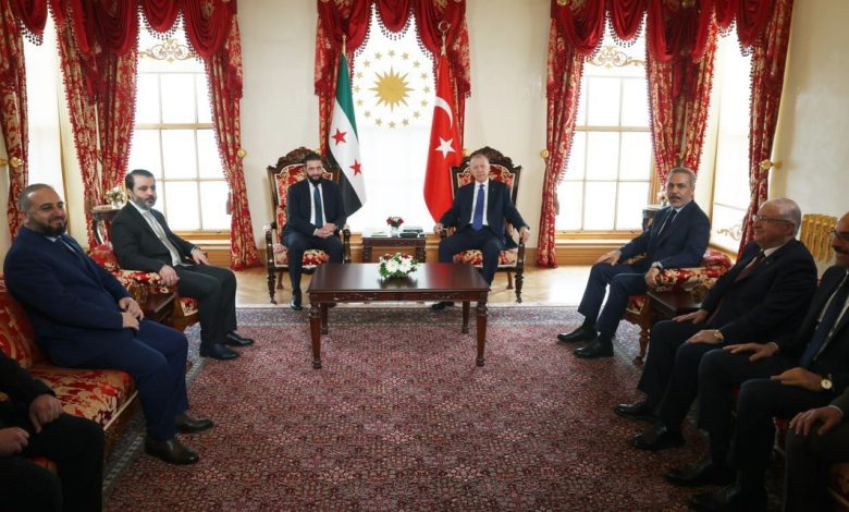 لقاء رسمي بين الرئيسين السوري والتركي :في تطور دبلوماسي لافت، استقبل الرئيس التركي رجب طيب أردوغان، اليوم السبت، نظيره السوري أحمد الشرع، في اجتماع رسمي عُقد داخل مكتب العمل الرئاسي في قصر دولما بهجة التاريخي بمدينة إسطنبول، بحضور كبار المسؤولين من كلا البلدين.